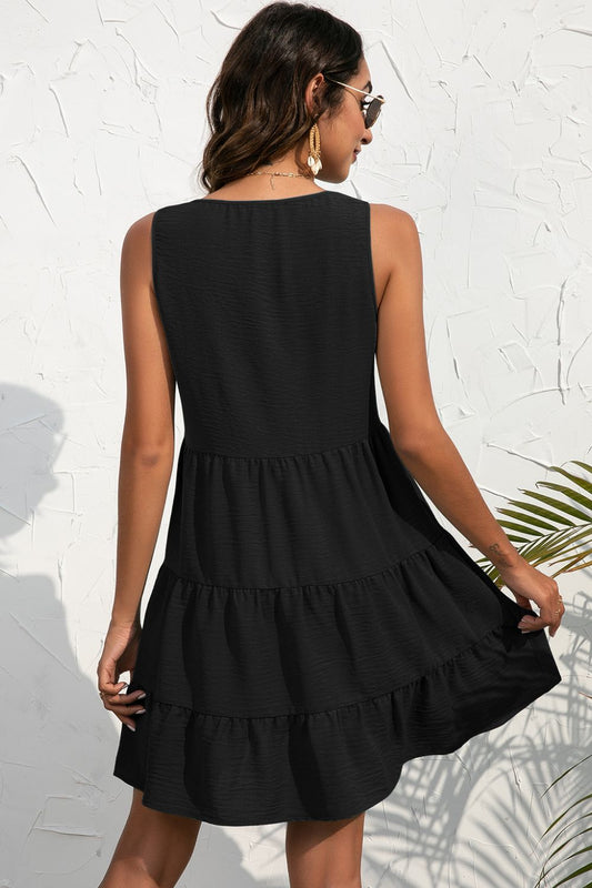 Woman's Tiered Sleeveless Dress V-Neck with Decorative Buttons